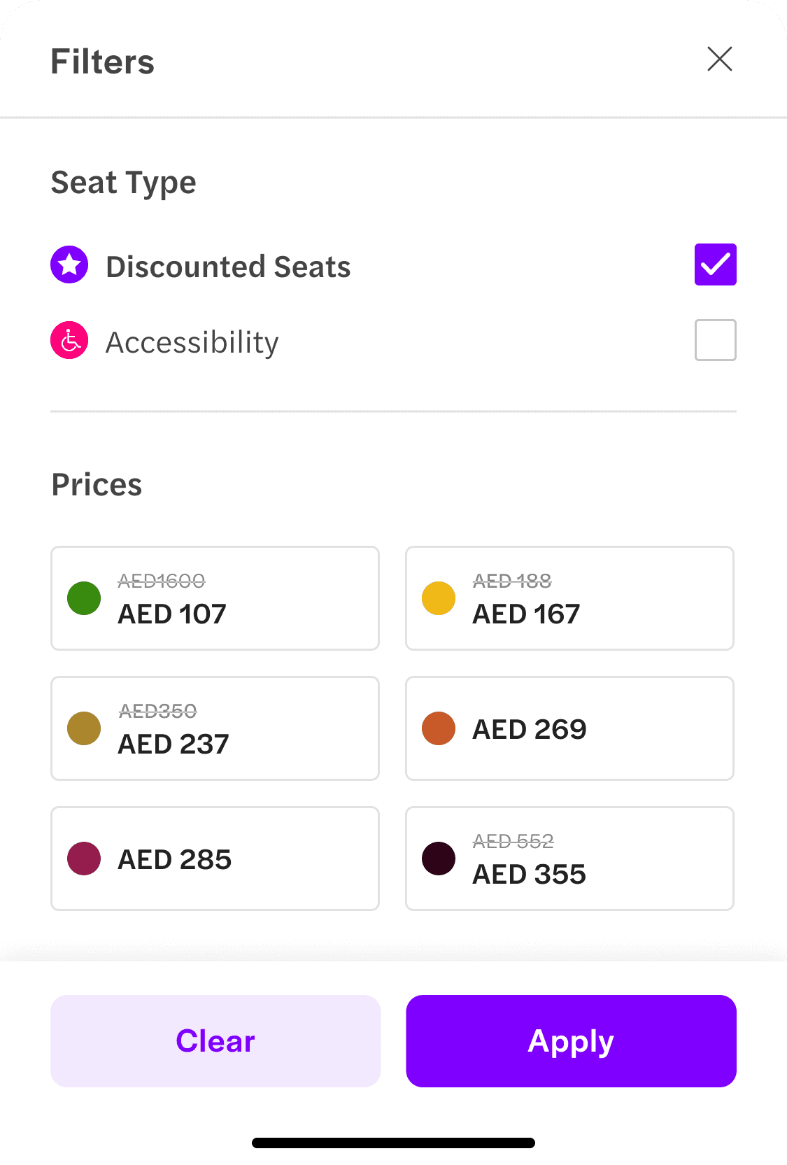 Currently live version has only price based filters, but in ideal scenario we want to give emphasis on accessible seats as well as special promos.